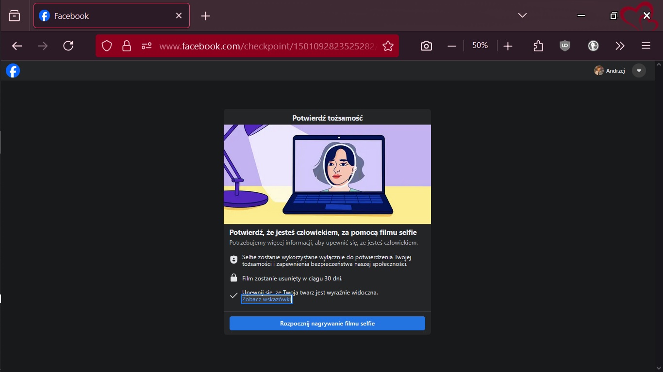 Nie mam zaliczonego przez nich z Meta robionego godzinami selfie i zmianami haseł dobrych, kodów dobrych itd., itp. Chociaż widzę pięć kółeczek pozytywnych z kolorem blu.