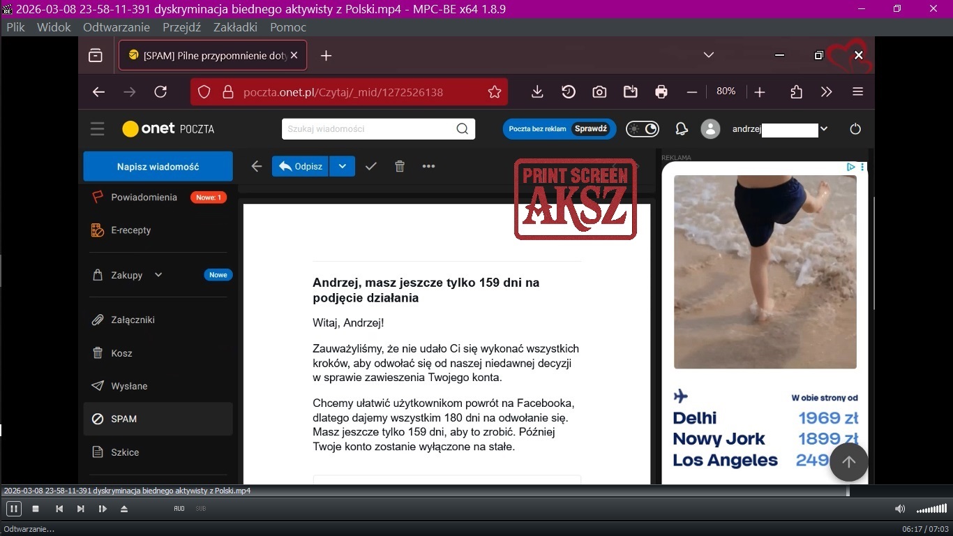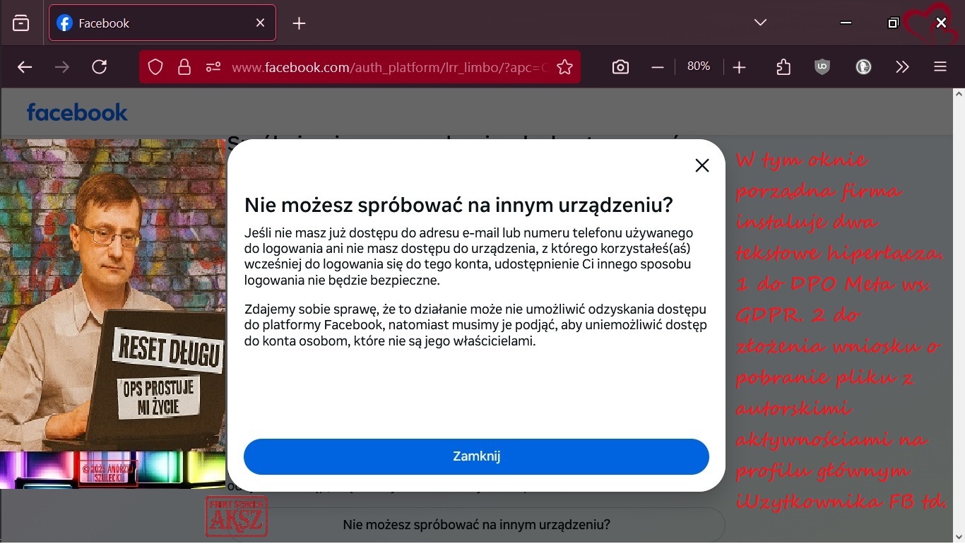 To historia ogólna. W szczegółach to nadal mnie filmują pod różnymi zmyślonymi zarzutami, szukają na siłę pretekstu, zastawiają pułapki na witrynie, blokują przyciski [Wyślij] formularza do DPO Meta itd., itp.