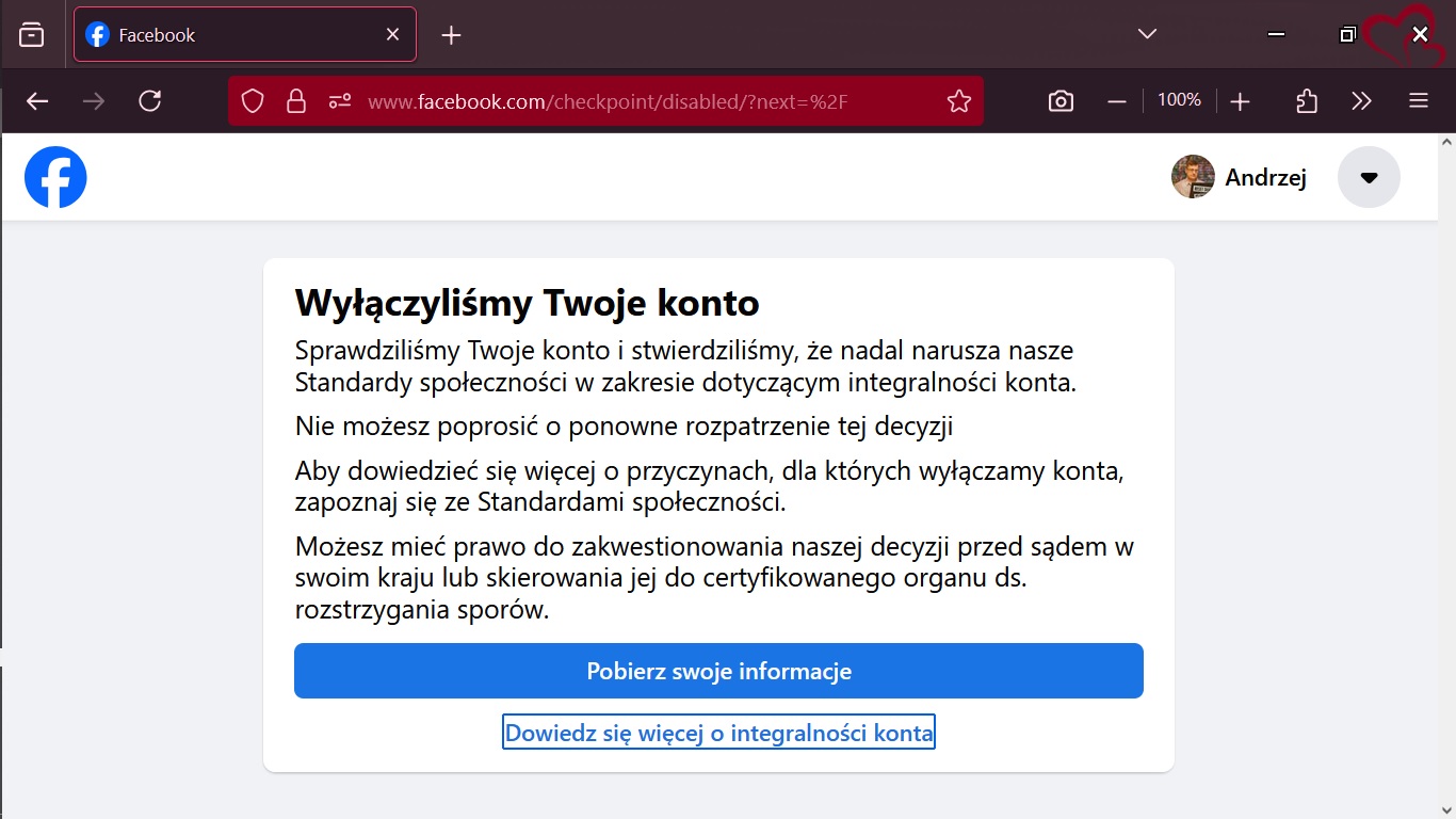 Fortel 180 dni to jest quasi oszustwo bo nie naruszam żadnych zasad społeczności, standardów społeczności – nie piszą którą społeczność mają na myśli – bo pewnie naruszam zasady i spokój społeczności pracowników Meta w tym tych na kierowniczych stanowiskach w dziele Zabezpieczeń, Bezpieczeństwo, Ochrona. Chcę zwolnień w tym dziale. Nie obronili mnie przed potarganymi algorytmami Meta, przed przestępcą (czarnym hakerem), który usunął mi stronę FB z wierszem o matce. Nie przywrócili tej strony w ciągu 30 dni. A teraz wyłączyli mi konto i zatarli ślady przestępstwa. Później odpiszą, że 30 dni już upłynęło i oni nie mogą mi tej strony z wierszem, poezją, rapem przywrócić. Bardzo mi współczują itd. NA PEWNO WIERZĘ W ICH WSPÓŁCZUCIE. 🙂