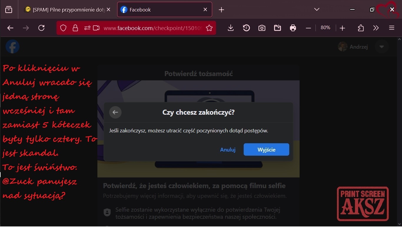 Domyślam się, że algorytmy Meta „się zesrały” gdy próbowałem się zalogować z przeglądarki Firefox a mieli zanotowane przeglądarkę Brave. Doszło inne IP od ISP, bo mam nowe raz na 24 godziny, a może i częściej. VPN nie mam. Z proxy nie korzystam. Dobrze głową kręciłem na sesji. Miałem 5 kółeczek, wtedy jeszcze z kolorem blue, dobre hasło podałem, dobry kod 2FA z aplikacji uwierzytelniającej, reCAPTCHA rozwiązałem, kod z adresu e-mail (login do konta FB) doręczyłem właściwy, a oni mnie nie zalogowali. Moje zdjęcie z konta FB wrzucili w okno do logowania na witrynie facebook.com a i tak nie zalogowali bez hasła, a obiecali, że tak zrobią. Nie dotrzymali słowa tego dnia wielokrotnie. Kilka godzin zmarnowałem na próbę nawiązania dialogu z Meta, a oni robili mnie psikusy. TO NIE JEST PROFESJONALNE PODEJŚCIE DO UŻYTKOWNIKÓW FACEBOOK I NIEZGODNE Z REGULAMINEM, PRAWDA #Zuck? I tak na okrągło jednego dnia – NIEDAWNO – MNIE SZYKANOWALI I DYSKRYMINOWALI.